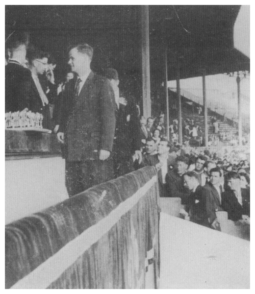 | Where captains of F.A. Cup sides receive the trophy, Kevin Mussen mounts the rostrum at Wembley Stadium in '59 after victory over Galway. |