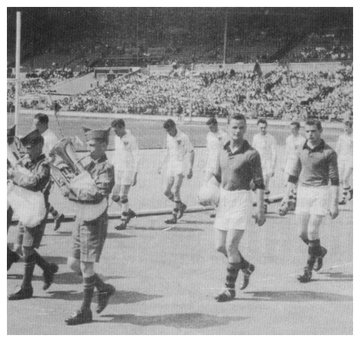 | Following in the footsteps of famous soccer stars, captain Kevin Mussen leads the Down team on to the field at Wembley for the 1959 tournament final versus Galway. |