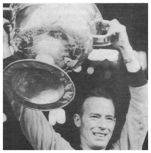 | Captain of the 1968 side Joe Lennon holds the Sam Maguire Cup above his head. |