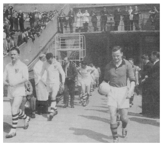 | Following in the footsteps of famous soccer stars, captain Kevin Mussen leads the Down team on to the field at Wembley for the 1959 tournament final versus Galway. |