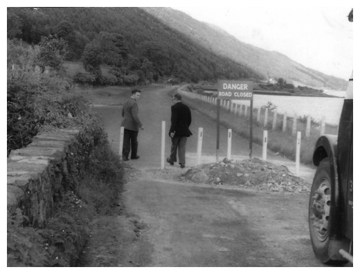 A bus is halted by bollards on the Newry-Omeath road in the late 1950's.
